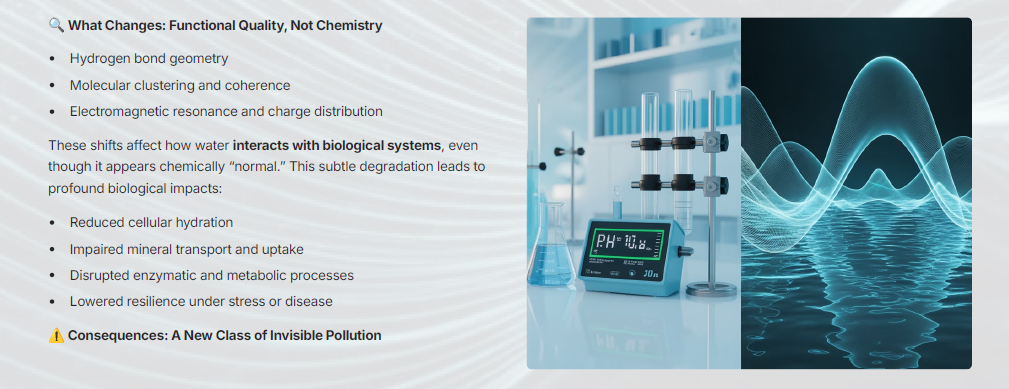 Perhaps the most concerning aspect of electromagnetic interference on water is its invisibility to conventional analysis. Standard water quality tests pH, TDS, BOD, heavy metals, microbial counts are blind to these disruptions because, the chemical composition remains unchanged. H¢O molecules are still intact, dissolved minerals are still present, no new contaminants are introduced.