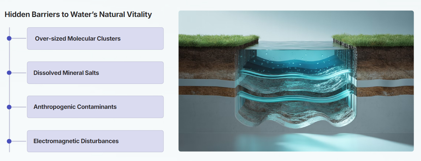 Operating below the threshold of visibility, these forces constrain waters natural dynamism and bioavailability triggering inefficiencies across every sector where it is applied.